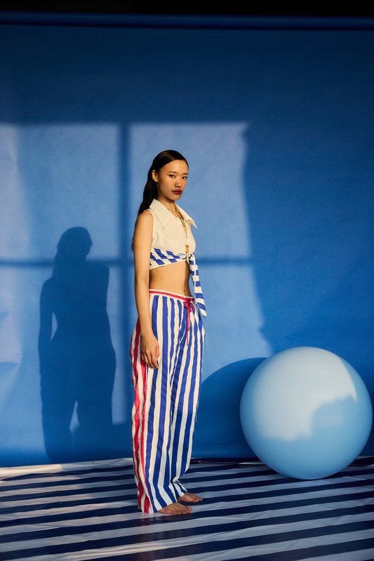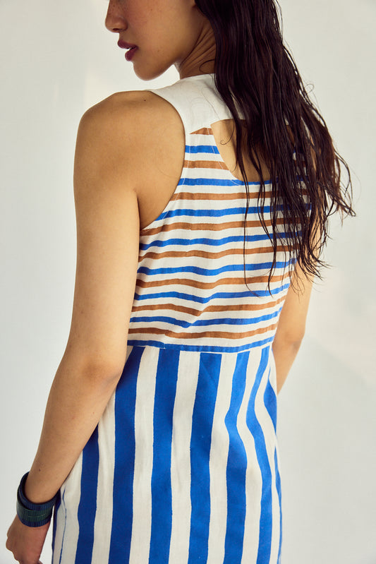 We wanted to recreate the preppy aesthetic of ready to wear from the 1990s using our preferred practices. We chose to hand block print our stripes instead of using traditional powerloom textiles. We love the uniqueness it offers to our weaves and the presence of hand in each piece.